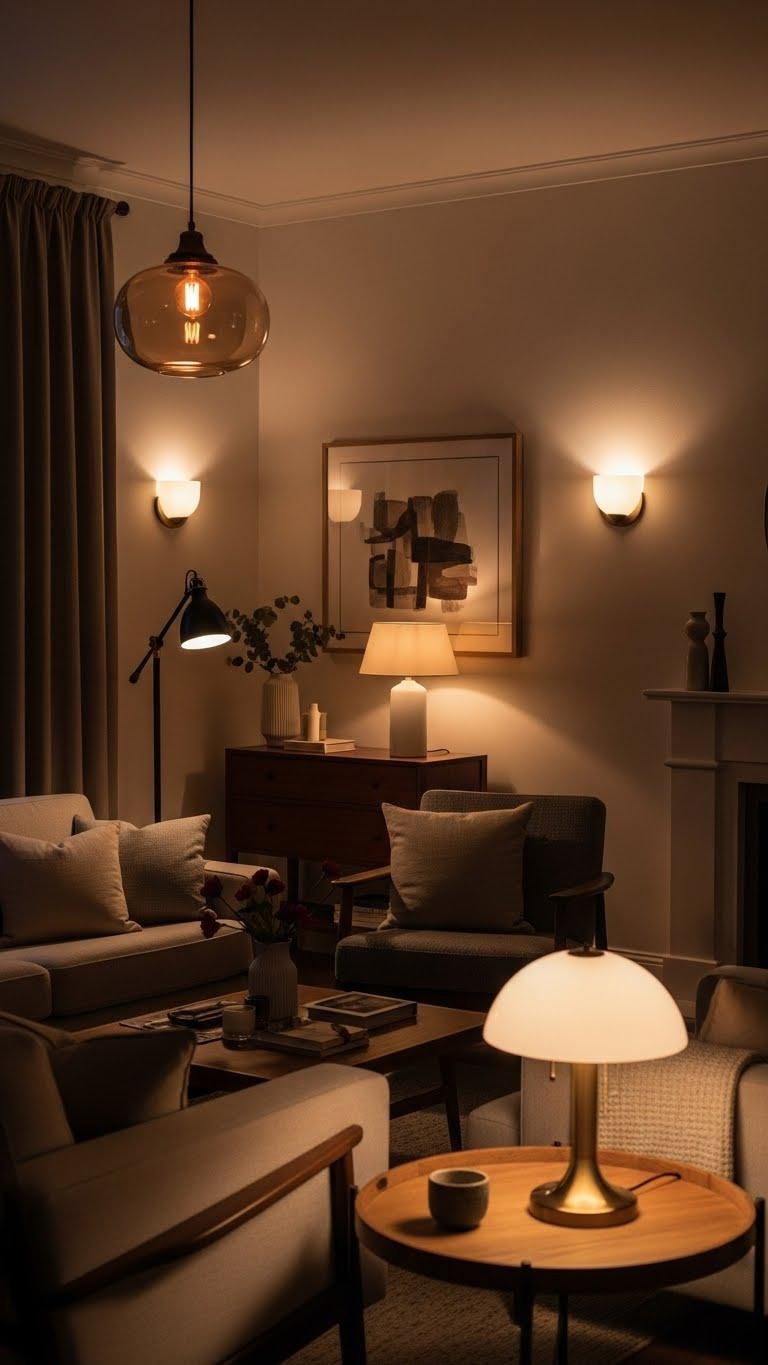 Balance overhead warmth with soft sconces for layered depth, add floor and table task lights for function, and adopt dimmer strategies to control mood.