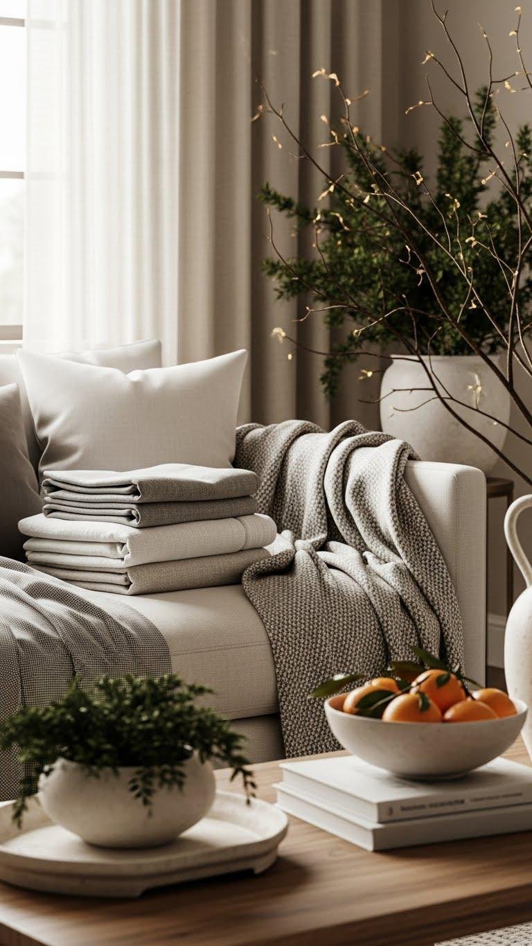 You’ll swap lightweight seasonal throws for cozy wool, introduce sculptural branches or citrus for freshness, and add subtle holiday neutrals that shimmer without shouting.