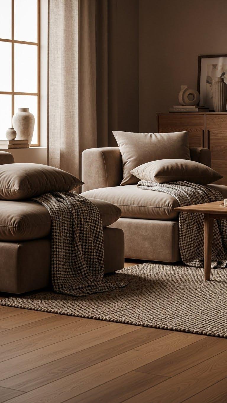 After you’ve anchored a room with sienna wood, layer in taupe textiles to soften the look and add tactile richness.