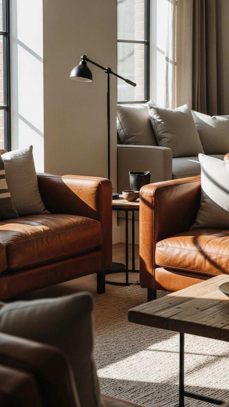 Choose warm brown leather seating to anchor a neutral room with instant character and lasting durability. You’ll appreciate its lived-in patina care benefits—leather softens beautifully while resisting wear. Mix textures and contrast pairing with linen, wood, or metal to keep the palette fresh. Opt for clean silhouettes that let the leather breathe; maintain finish with simple, intentional upkeep for timeless, liberated living.