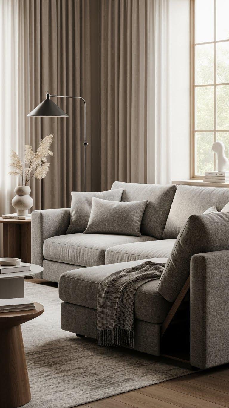 You’ll choose pieces like a textured velvet sofa or a modular chaise to craft flexible seating that feels luxurious without shouting.