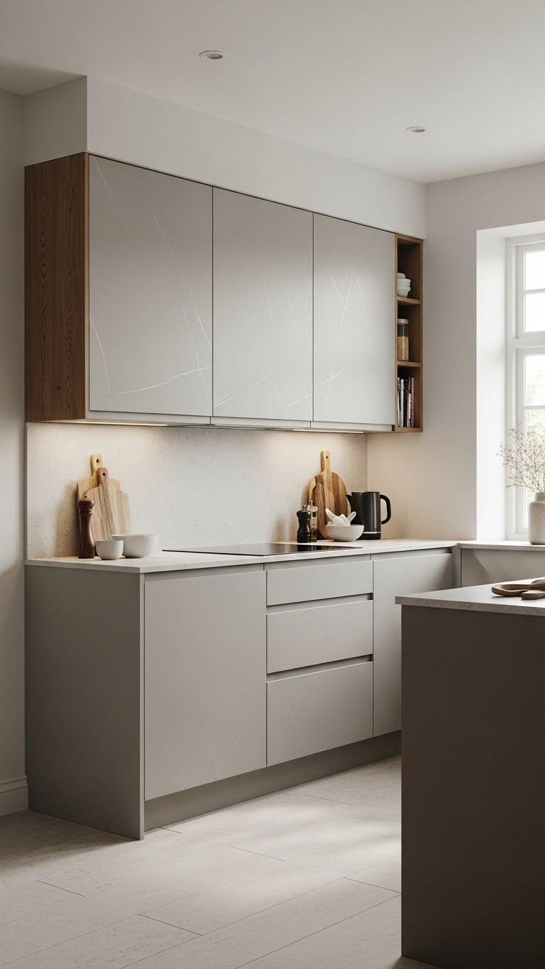 Pearl gray cabinetry gives your kitchen a refined, modern-neutral anchor that complements pale stone counters and warm wood tones without stealing the show. You’ll appreciate a matte finish that reads contemporary while subtle pearl veining adds depth.