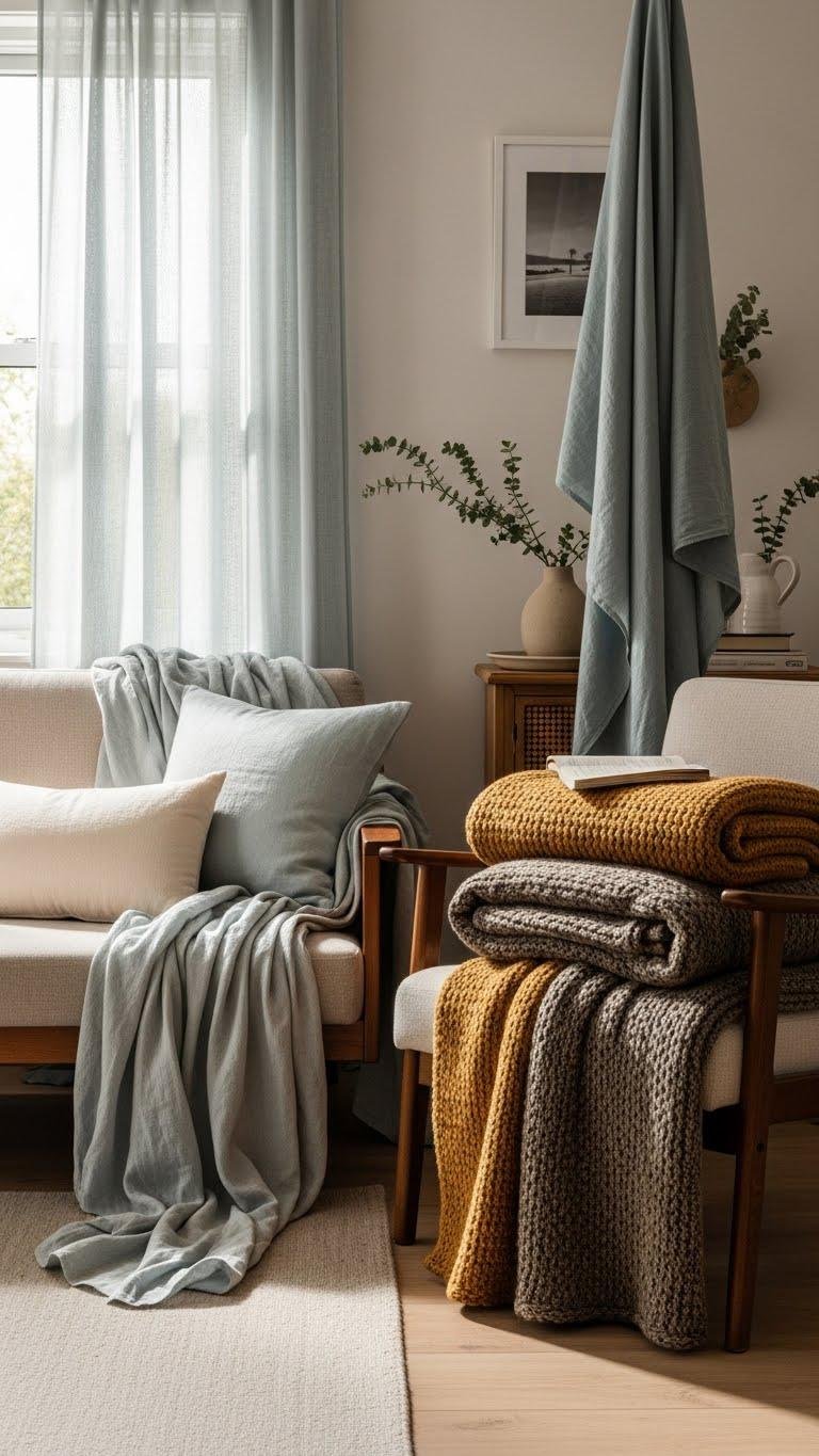 You’ll embrace seasonal swaps—lighter linens and breezy throws in summer, plush wools and textured weaves in winter—so the space breathes with you.