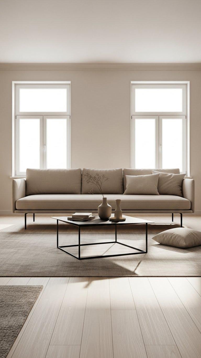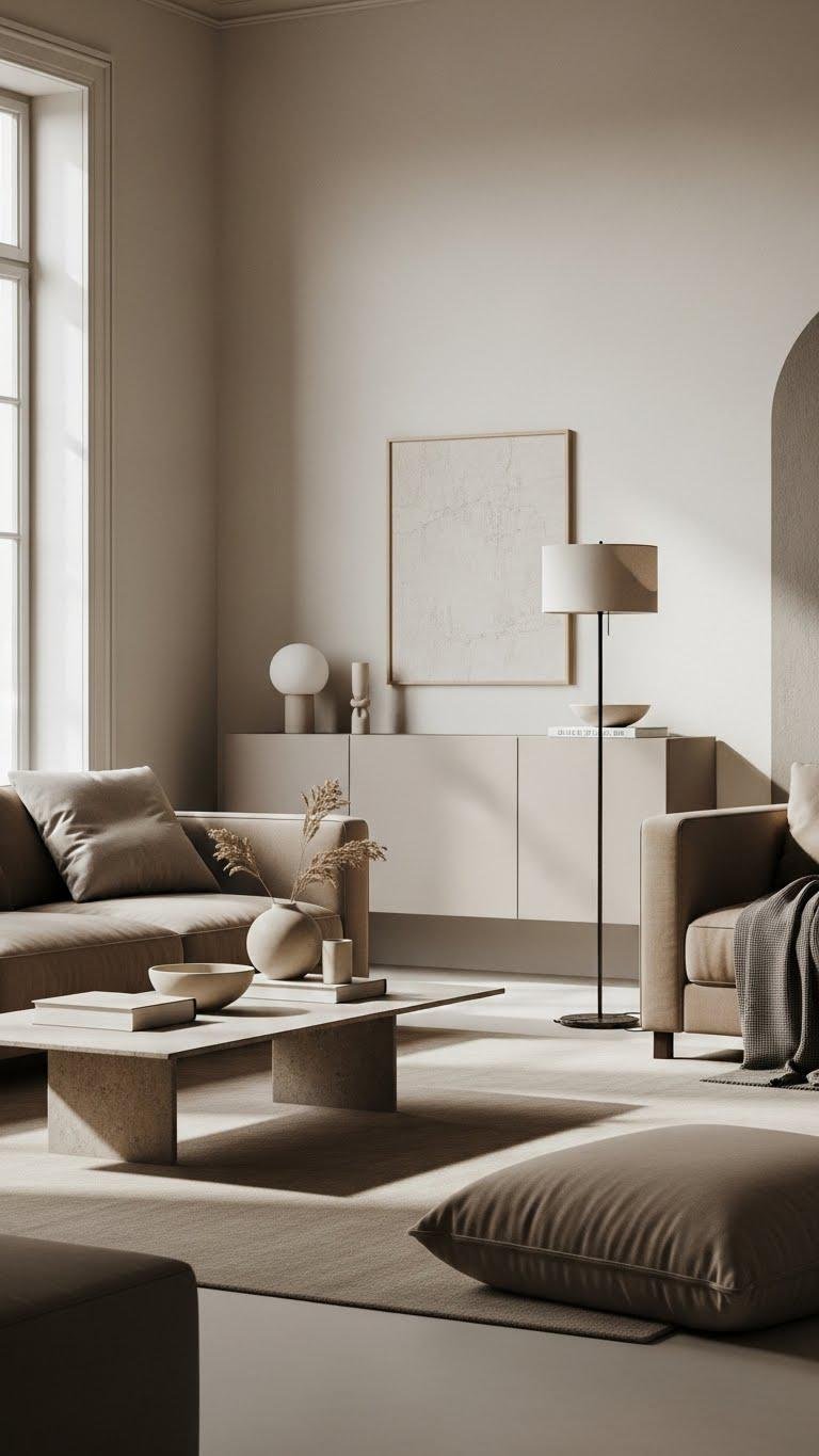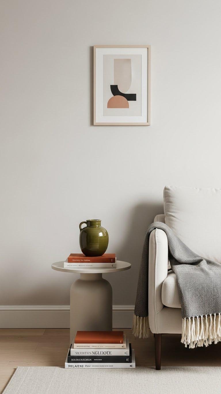 Bring a single accent hue in sparingly and let it punctuate the neutral field—think a hand-thrown ceramic in deep olive, a stack of coffee-table books with a russet spine, or a narrow throw draped over an armchair—so each small element reads as intentional rather than decorative noise.