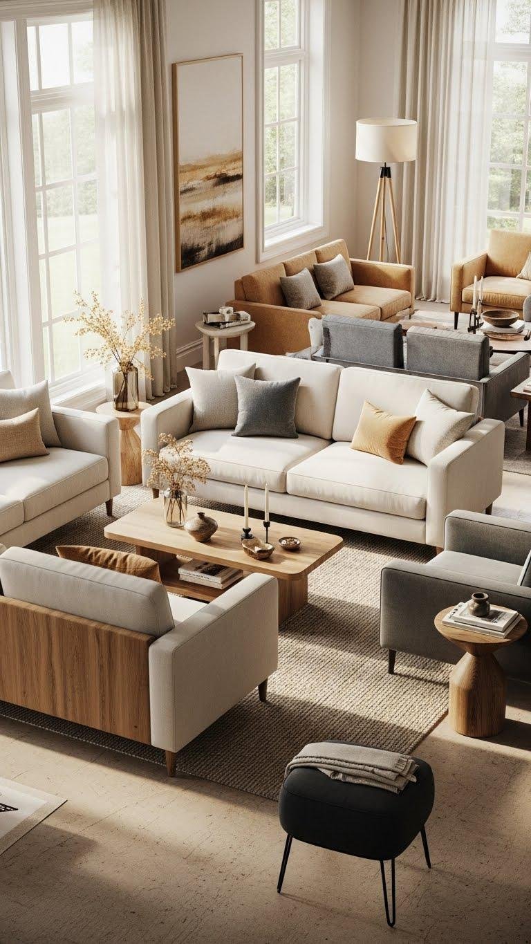 After you’ve warmed the room with mixed woods, soften the overall look by working in a range of off‑white shades that keep the palette light without feeling flat.