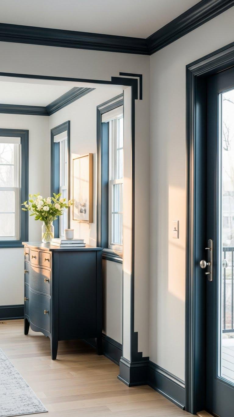 You’ll choose high contrast hues on trim profiles and painted molding to craft a crisp, modern edge. It’s an easy, freeing update that reads like design confidence, not construction.