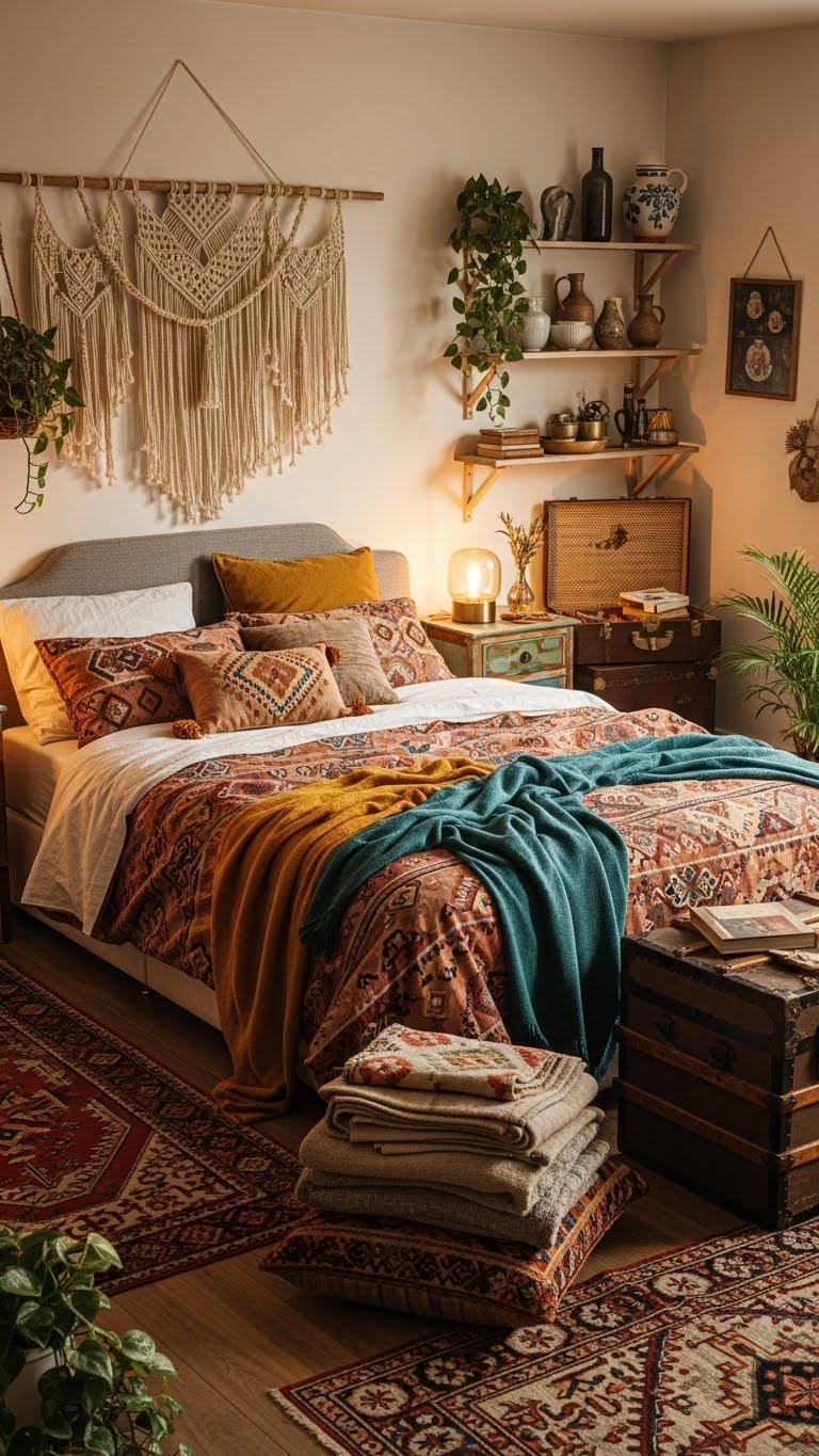 When you mix global textiles, layered rugs, and unexpected color clashes, your bedroom becomes a relaxed, highly personal retreat that reads like a collected story.