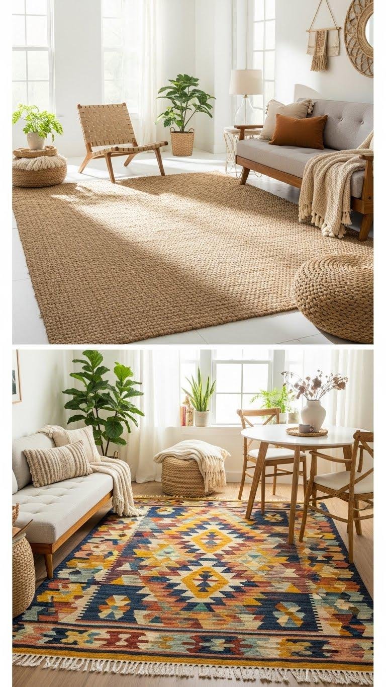 Anchor your space with a statement rug that does the heavy lifting—defining zones, setting the color story, and grounding layered textures. Choose an oversized sisal for airy, liberated minimalism or a bold geometric kilim to inject energy and pattern. You’ll anchor seating, delineate eating areas, or highlight a reading nook. Mix scale confidently; let the rug steer the room’s mood.