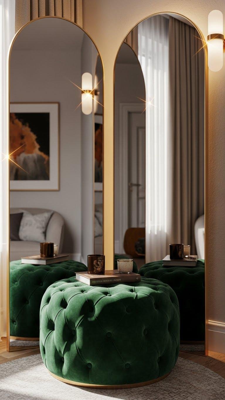 Pair a jewel-toned plush ottoman with slim arched wardrobe mirrors to bounce light and elongate walls. You’ll create a liberated, luxe canvas—soft textures, clean lines, and reflective geometry that feel both personal and elevated.