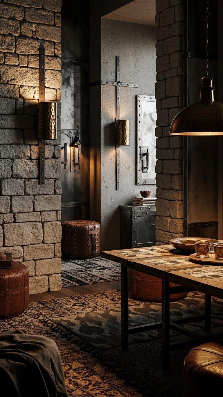 If you want to introduce a medieval edge without feeling dated, mix rough-hewn stone textures with burnished metal accents to build depth and drama. You’ll balance aged ironwork hardware, hammered lighting, and subtle stone inlays for grounded, adventurous rooms.