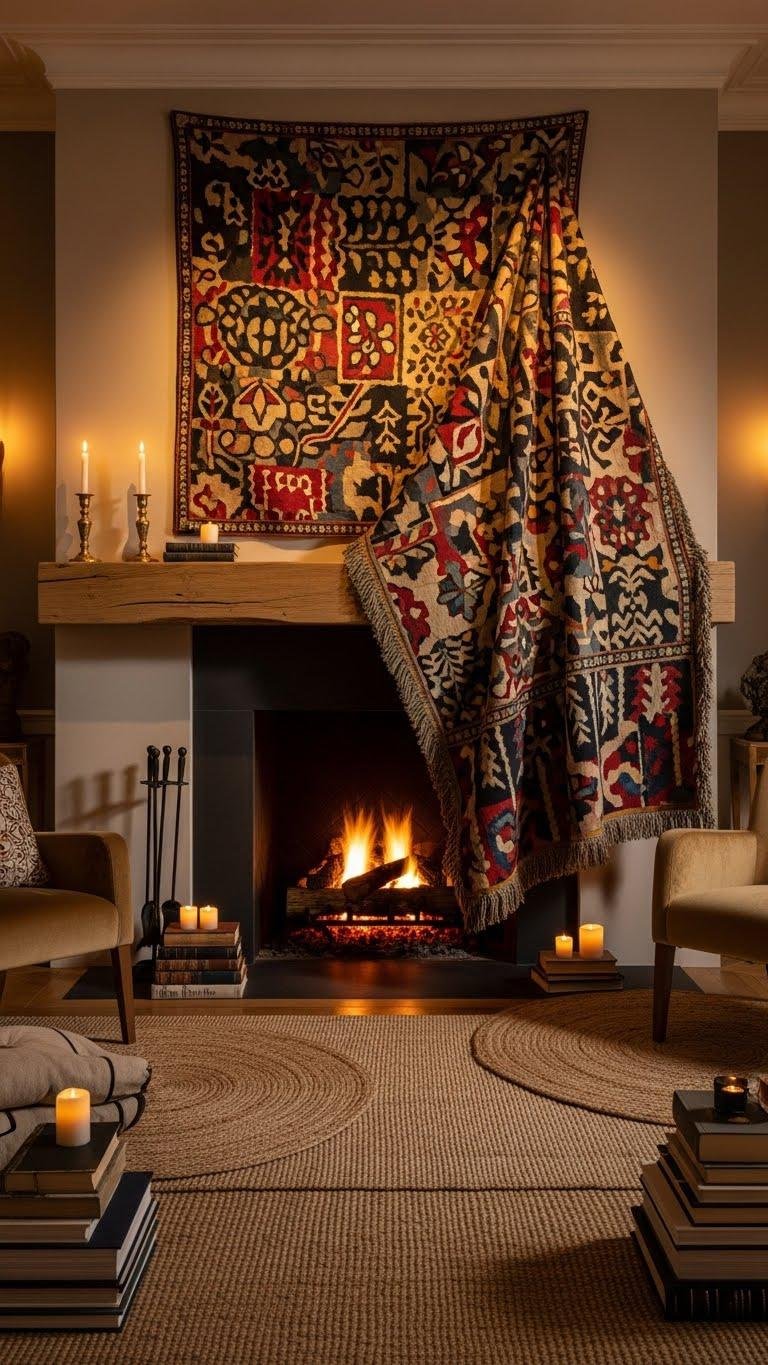 Bring a tapestry into the fireplace zone to instantly heighten warmth and storytelling—drape it above the mantel or hang it within the recess to create a layered focal point that reads as both art and insulation. You’ll craft a tapestry mantelpiece that feels liberated and luxe; mix scale, texture, and bold motifs to build a woven hearthscape that commands attention without feeling fussy.