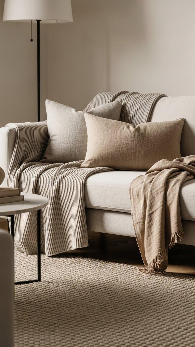 You choose soft neutrals that let light breathe, then add textured layers—wool throws, linen cushions, a single sculptural lamp—to create depth without clutter.