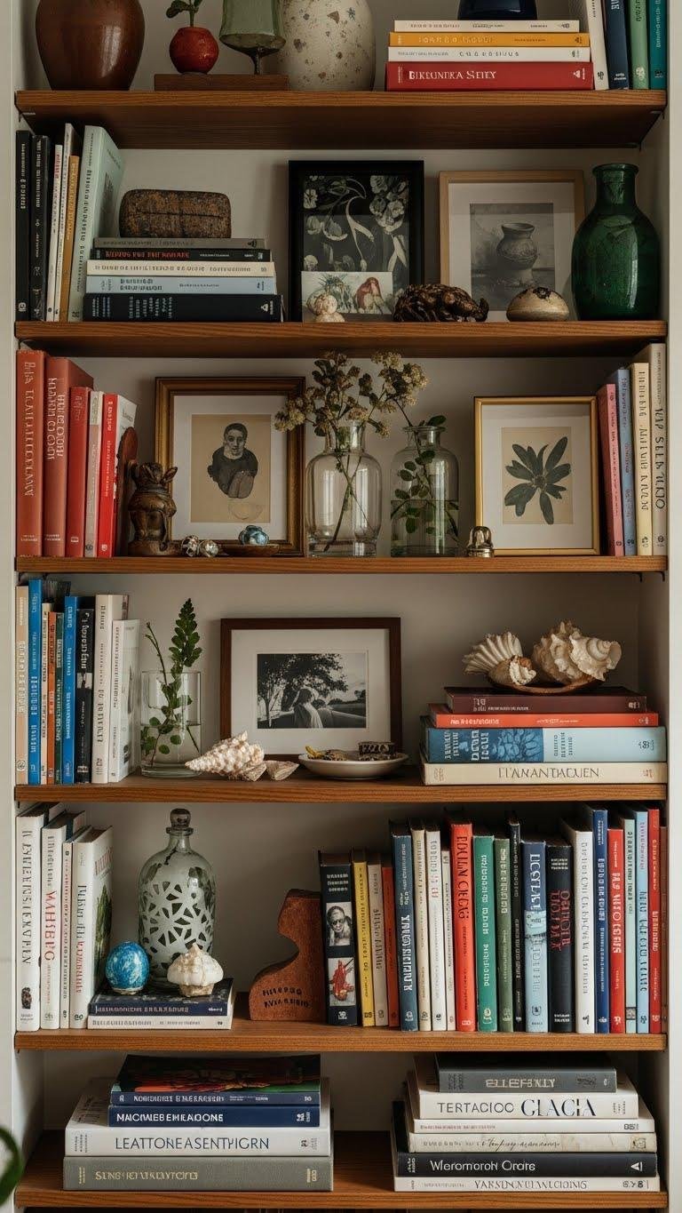 Although books are the backbone, your shelf becomes a story when you mix volumes with objects, art, and found pieces that reflect a mood or moment.