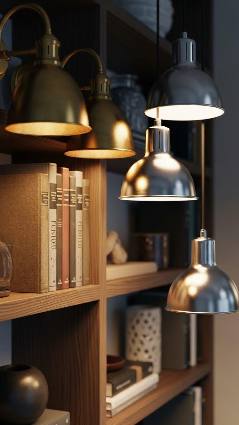 Curated bookshelves set the mood—now let lighting amplify it by layering mixed metals for depth and dimension. You’ll mix antique brass fixtures with nickel accents pendants to create contrast and movement.