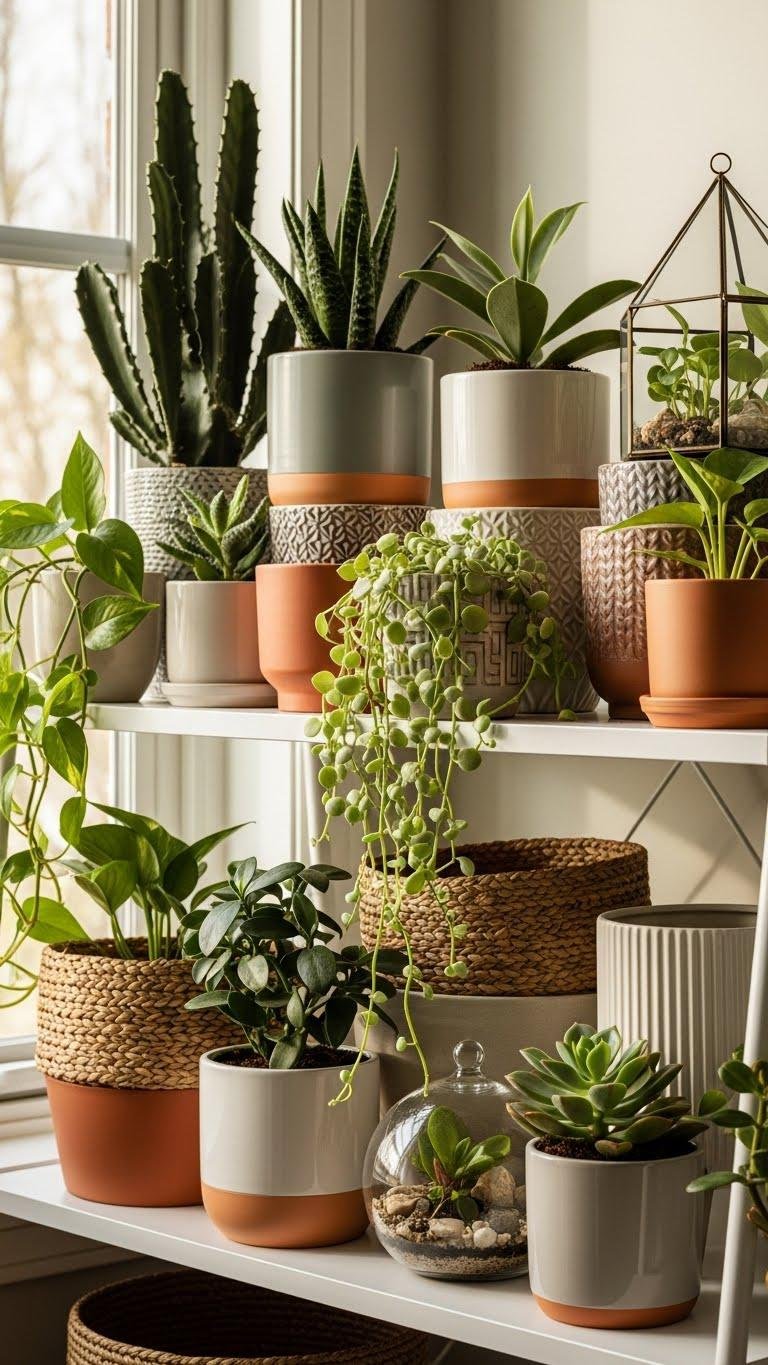 If you want your shelves to feel alive, layer plants in decorative pots that echo the room’s textures and tones. You’ll mix sculptural succulent arrangements with airy trailing pothos, pairing matte ceramics, woven baskets, and glass terrariums.
