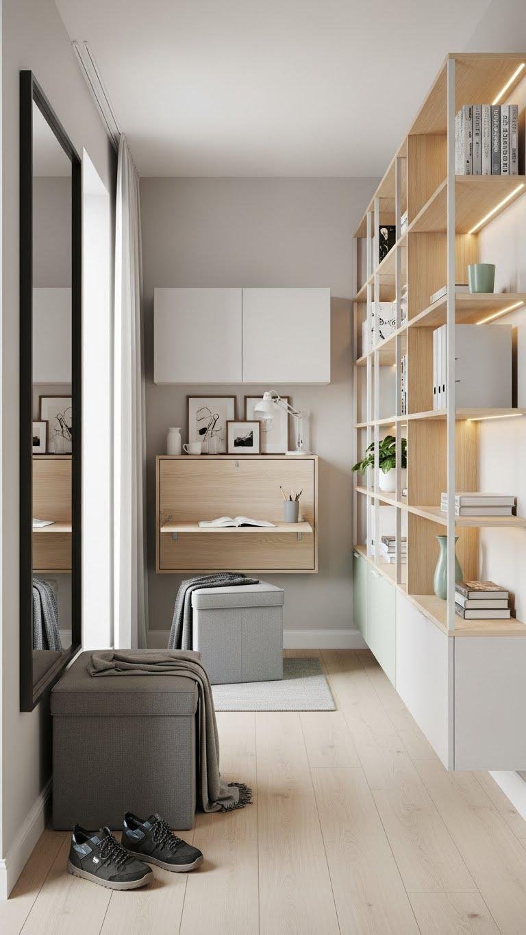 Make the most of every inch by thinking vertically and choosing pieces that pull double duty: slim shelving with integrated lighting, storage ottomans that double as seating, wall-mounted desks that fold away, and mirrors that bounce light while creating depth.