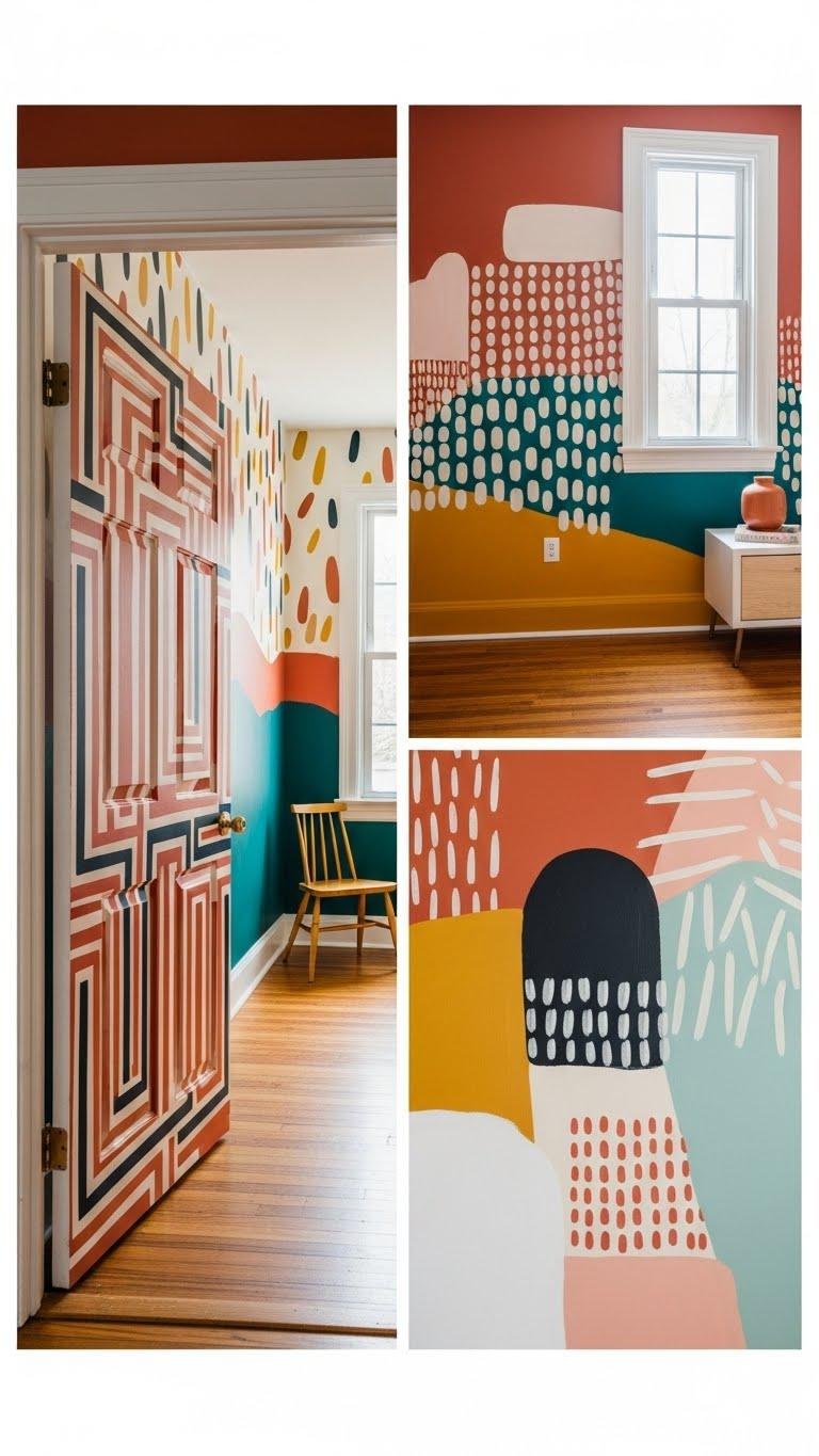 After a bold door mural announces your home’s personality, carry that energy inward with handpainted wall patterns that read like wearable art for a room. You’ll mix handpainted motifs and bold color fields, layer geometric repeats, or try personalized stenciling to mark moments. These pared-back, expressive patterns let you claim space, change mood on a whim, and live without design rules holding you back.