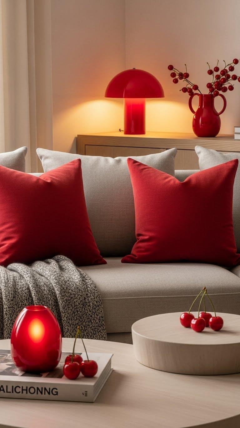 You’ll layer cherry pillows for instant warmth, balance them with neutral textures, and anchor corners with sculptural cherry lamps that glow like art. Keep lines clean, mix matte and gloss, and let bold red punctuate rather than dominate—so your space feels liberated and intentionally curated.