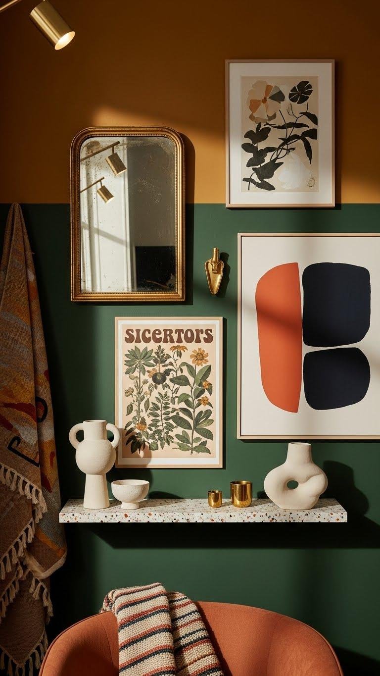 Shift your gallery-wall momentum into a richer, time-worn palette by layering vintage finds with crisp contemporary pieces—think a patinated gilt mirror beside a sleek terrazzo shelf, or a 1970s botanical print paired with an abstract, high-contrast canvas. You’ll mix handwoven textiles, sculptural ceramics, and brass accents for contrast, curating fearless compositions that celebrate history and modernity without feeling fussy or staged.