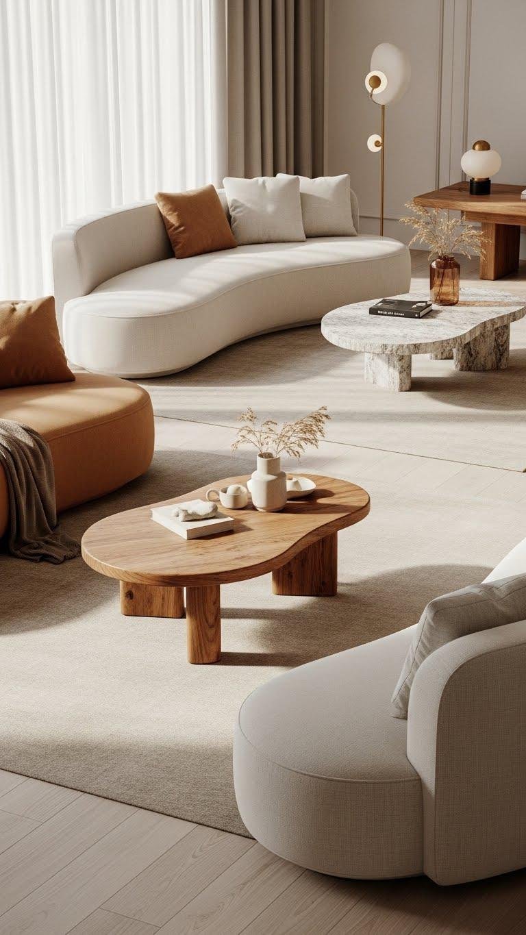 Soften the room’s edges with rounded, organic furniture that invites you to linger and relax. Choose rounded sofas with low profiles and soft upholstery to encourage barefoot wandering. Pair them with sculptural organic coffee tables in warm woods or textured stone for tactile contrast.