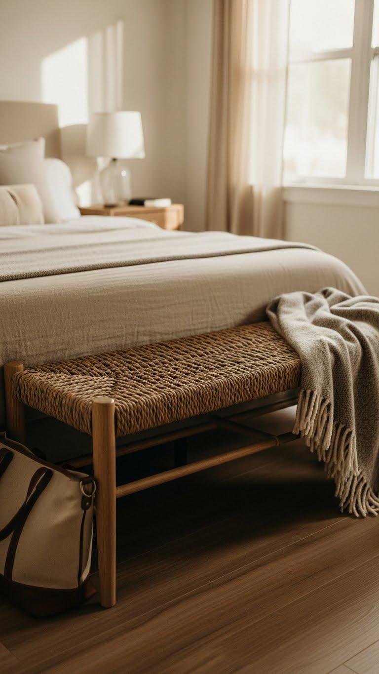 Tucked at the foot of your bed, a woven bench anchors the room with texture and purpose, giving you a place to sit, layer blankets, or drop a bag without disrupting the bed’s clean lines.