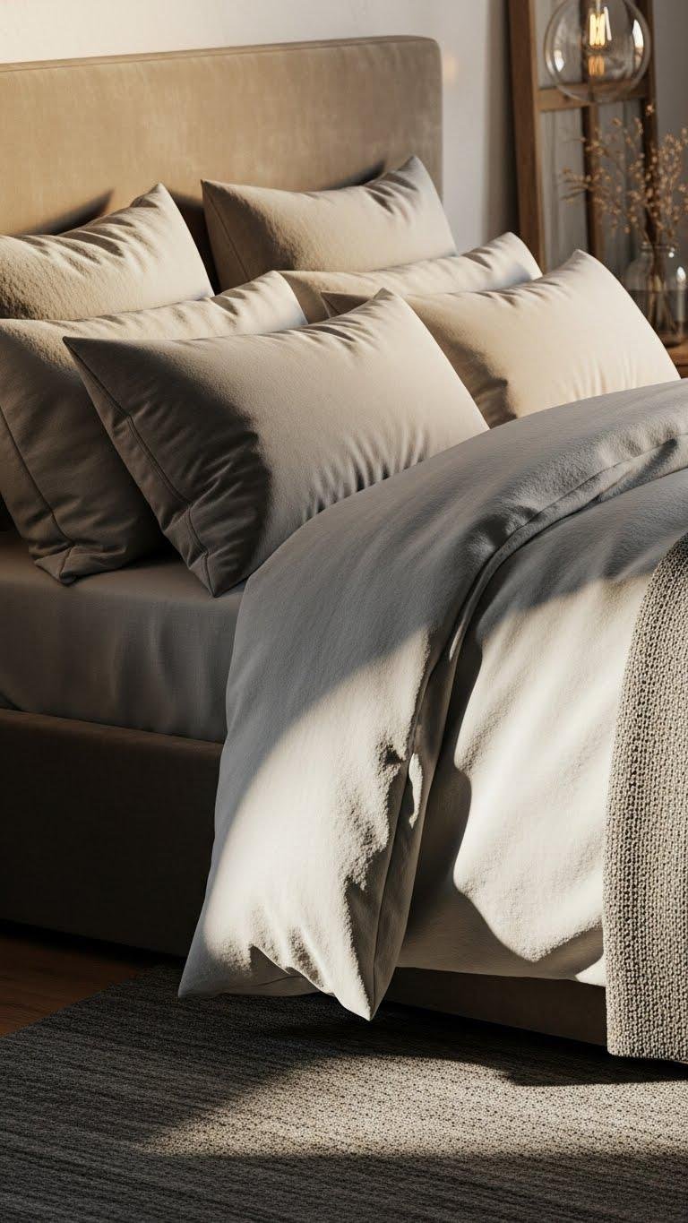 After you’ve settled a soothing plant corner, bring that same tactile calm to the bed by layering textured bedding and throws.