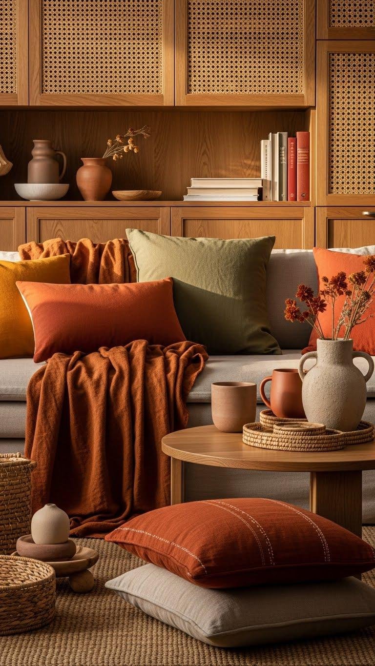 After grounding the room in wood and rattan textures, bring color into the mix with a warm, earthy palette that enhances those natural materials. You’ll layer sunset hues—burnt orange, ochre, deep sienna—paired with terracotta accents and muted olive.