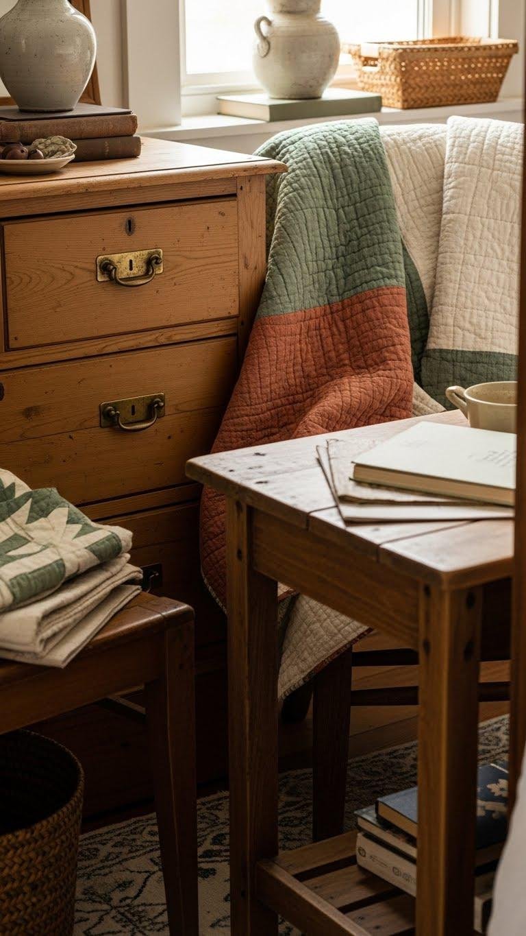 Bring in a well-loved dresser or a handcrafted side table to give your bedroom personality and a lived-in warmth that new pieces can’t match. Pair distressed brass hardware with purposeful patina, mix in handmade quilts for texture, and curate mismatched finds to reflect your freedom. You’ll create a layered, intentional look that feels collected, not staged, and invites everyday comfort.