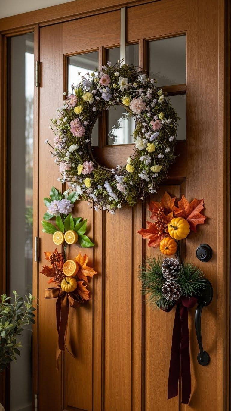 Swap pieces in minutes to keep your entry feeling fresh without a full redecorate: interchangeable door décor centers on a durable base—think neutral wreath, slim metal frame, or wooden ring—that accepts clips, magnets, or simple ties so you can layer seasonal accents quickly.