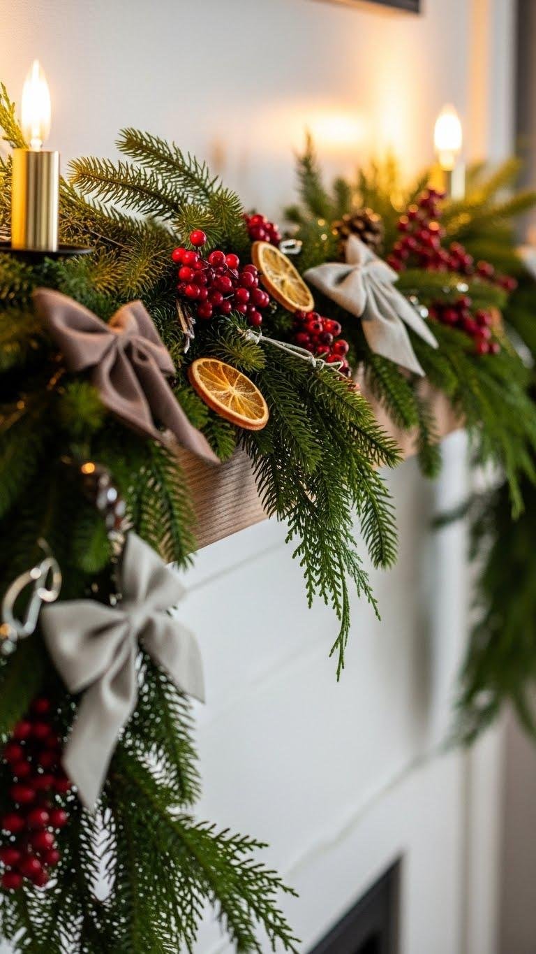 You’ll layer an evergreen base for year‑round structure, then swap accents: berries, dried citrus, metallic picks.