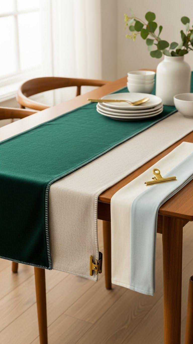 You can turn a simple runner into multiple looks by layering removable panels, trims, or toppers that clip or tie on—think a linen base with a stitched velvet overlay for evenings, then swap in a breathable cotton strip for daytime. You’ll mix color blocked runners and seasonal clip runners to create effortless shifts: swap textures, change scale, and refresh your table without storage fuss.