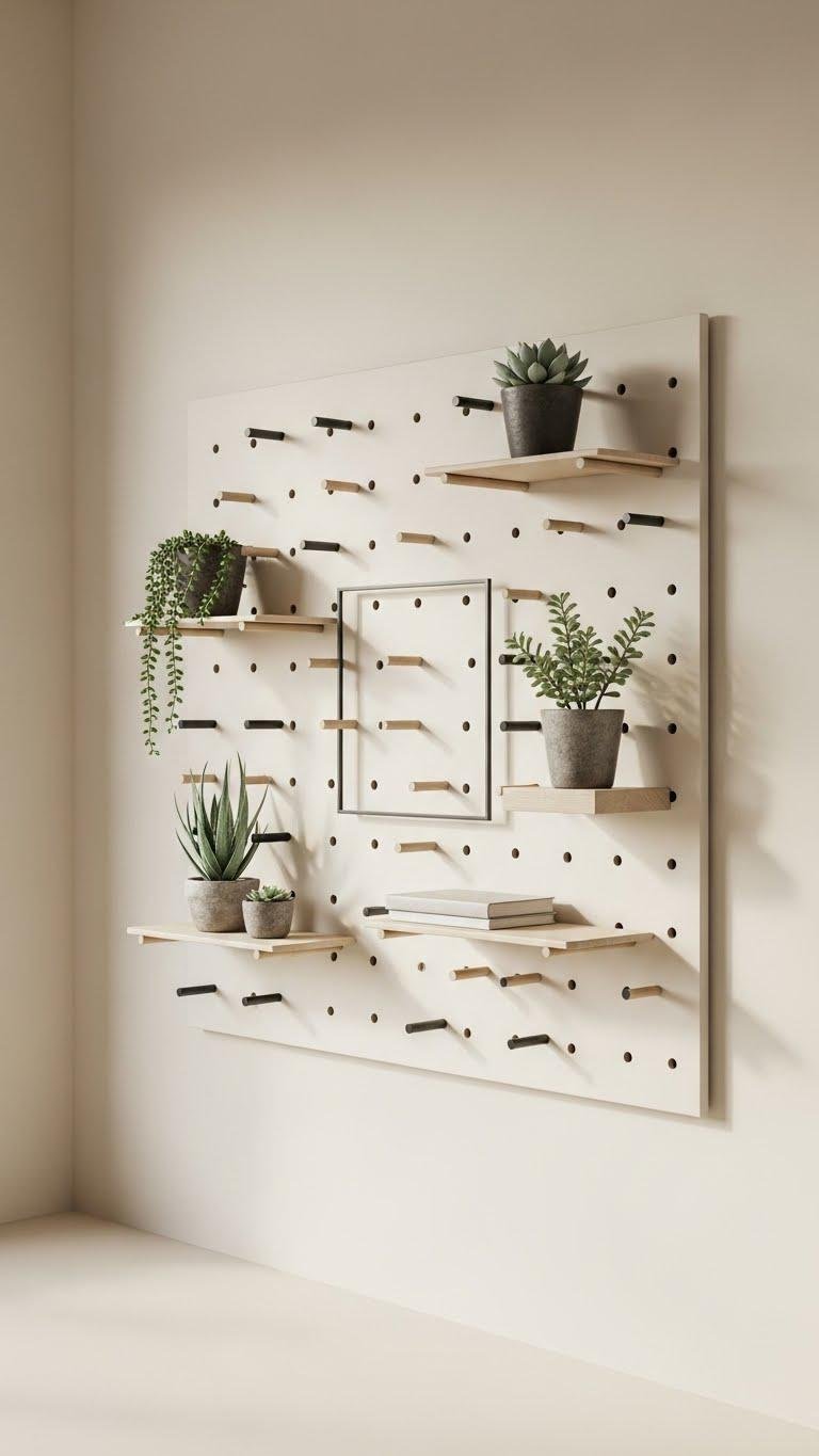 If you want a tidy, sculptural way to showcase objects without clutter, a minimalist pegboard delivers clean lines and flexible display.
