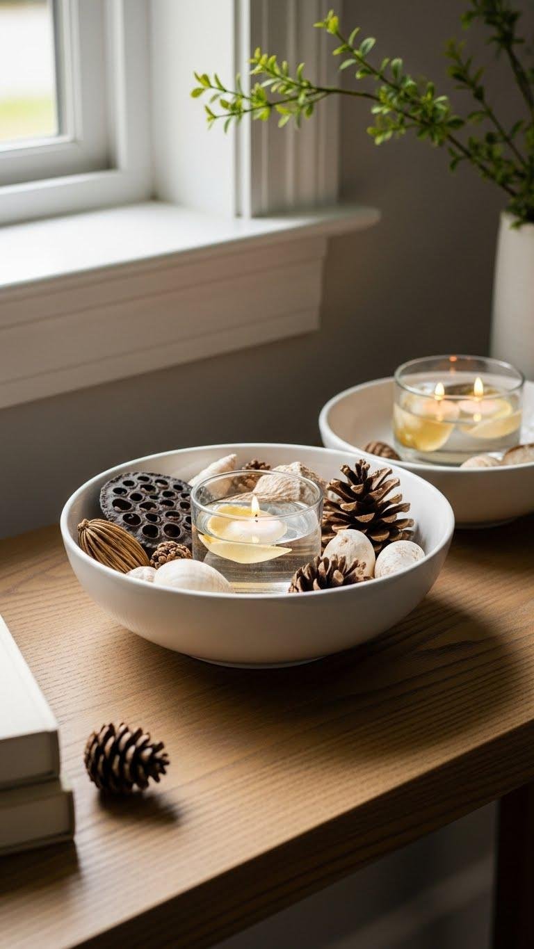 If your entryway can shift with a few clipped accents, your tabletop can do the same with a versatile centerpiece bowl that works all year. Choose a ceramic centerpiece for clean lines; swap seasonal fillers—pinecones, shells, dried pods—without fuss. Try a floating centerpiece for water-based displays or arrange continual foliage for low-maintenance, ever-ready style that lets you roam freely.