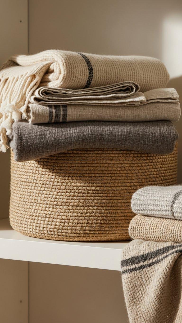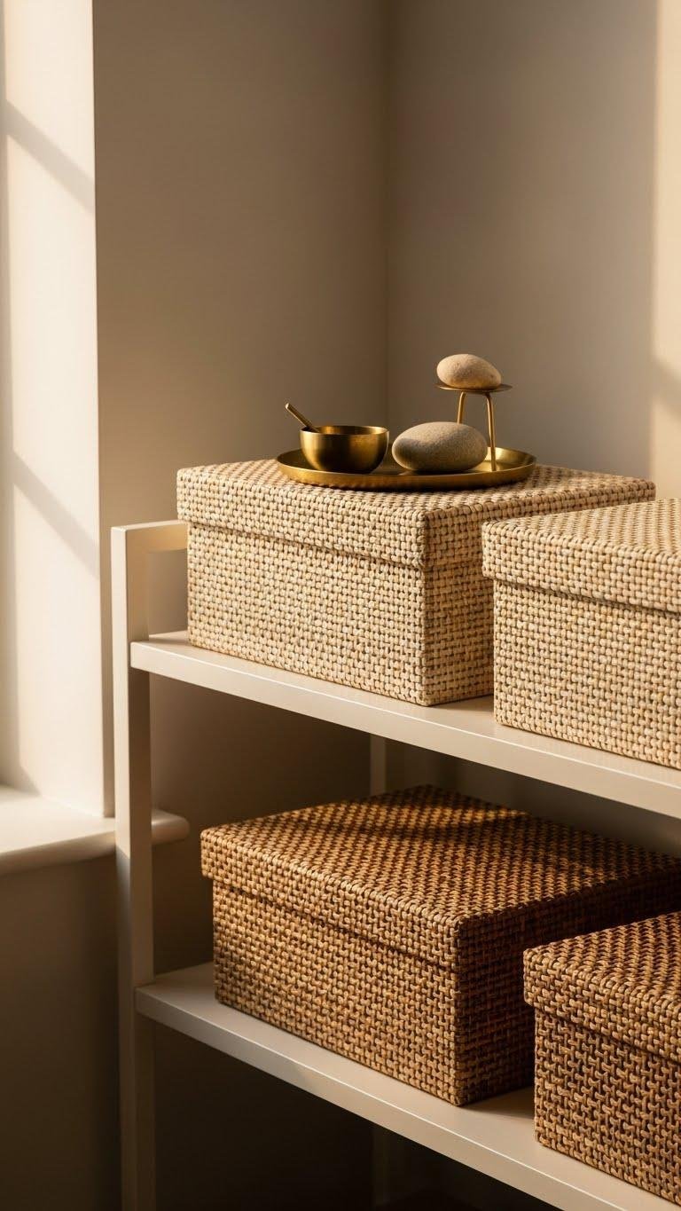 Choose woven bins for texture and cohesion, keeping contents hidden yet accessible.
