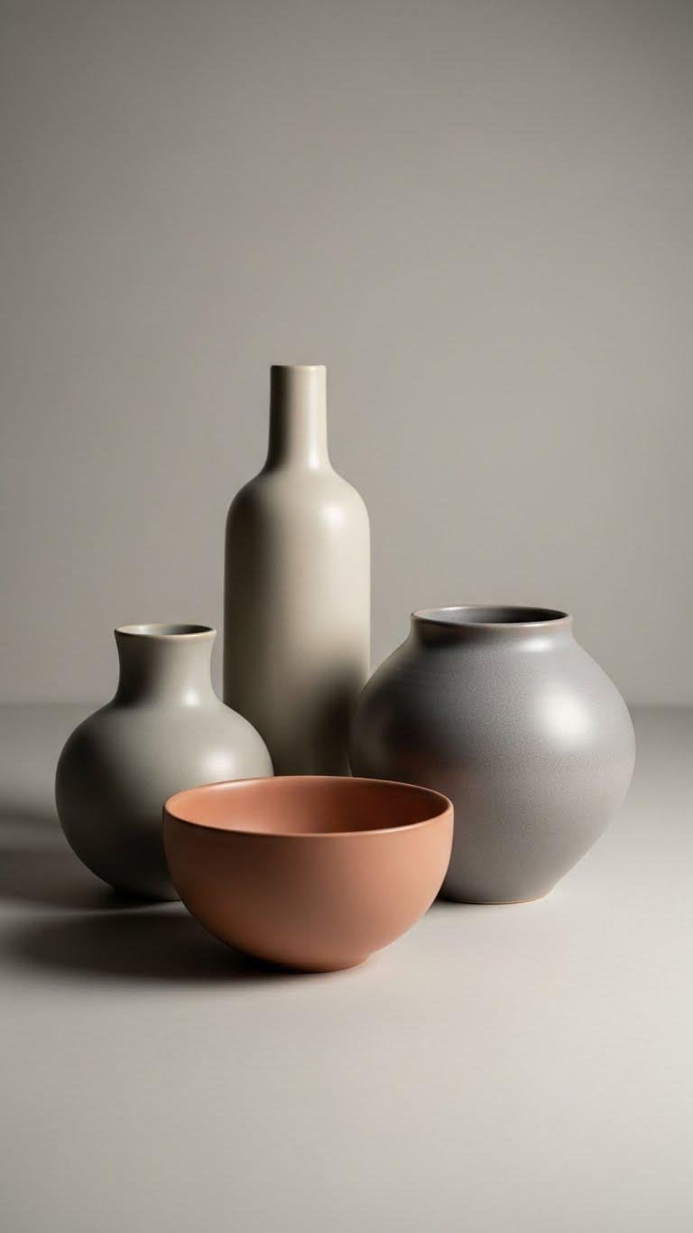 After you’ve set up contrasts in material and texture, arranging ceramics in odd-numbered clusters helps sharpen the composition and feels naturally resolved. You’ll place an asymmetrical trio—varying heights and silhouettes—so each piece breathes. Choose matte glaze finishes to mute glare and unify the set. Let negative space and confident spacing give the display an effortless, liberated calm you can live with.