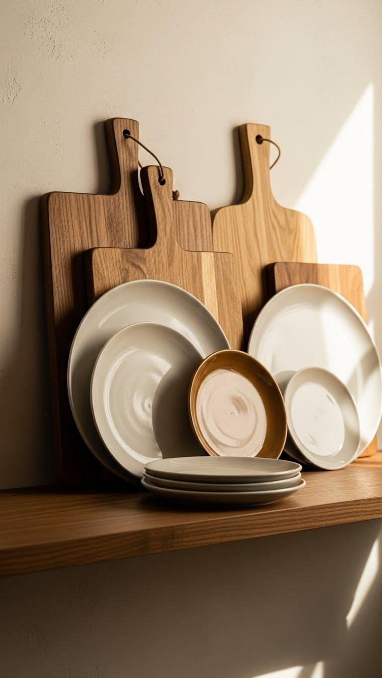 Pairing plates and cutting boards as a backdrop instantly adds structure and warmth to your shelf styling; place them leaning against the wall at staggered heights to create a layered, architectural frame for your objects.