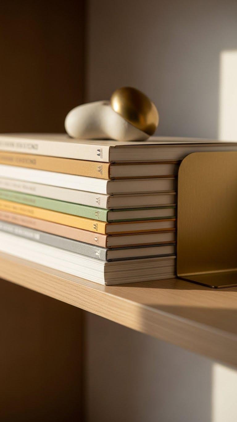 You’ll layer slim volumes in a layered horizontal stack, letting textures and color breathe.