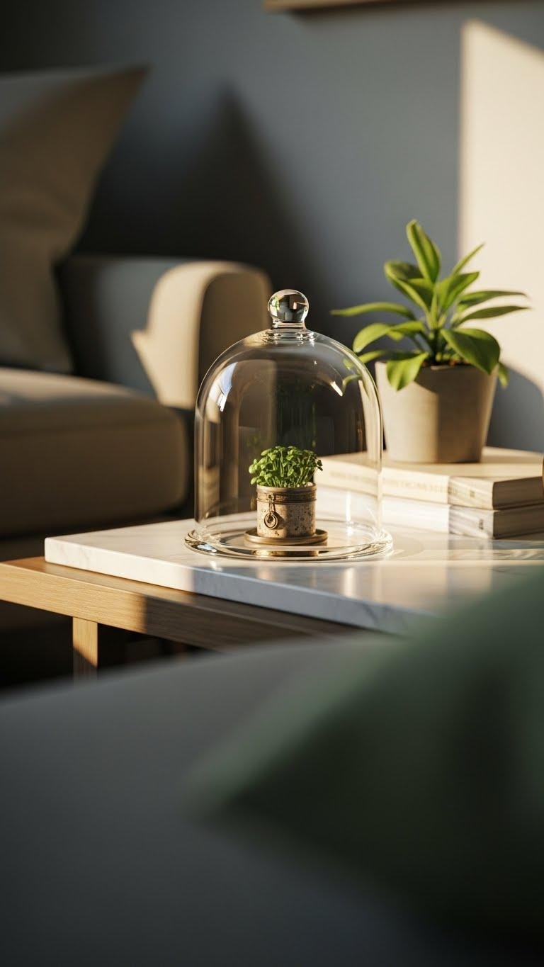 Bring a glass cloche into your vignette to create an instant focal point that feels both precious and approachable. You’ll place an antique cloche over a small object or plant, letting terrarium styling breathe life without clutter. Keep surrounding pieces low and matte so the cloche shines. You’ll enjoy a calm, liberated display that reads curated, balanced, and effortlessly personal.