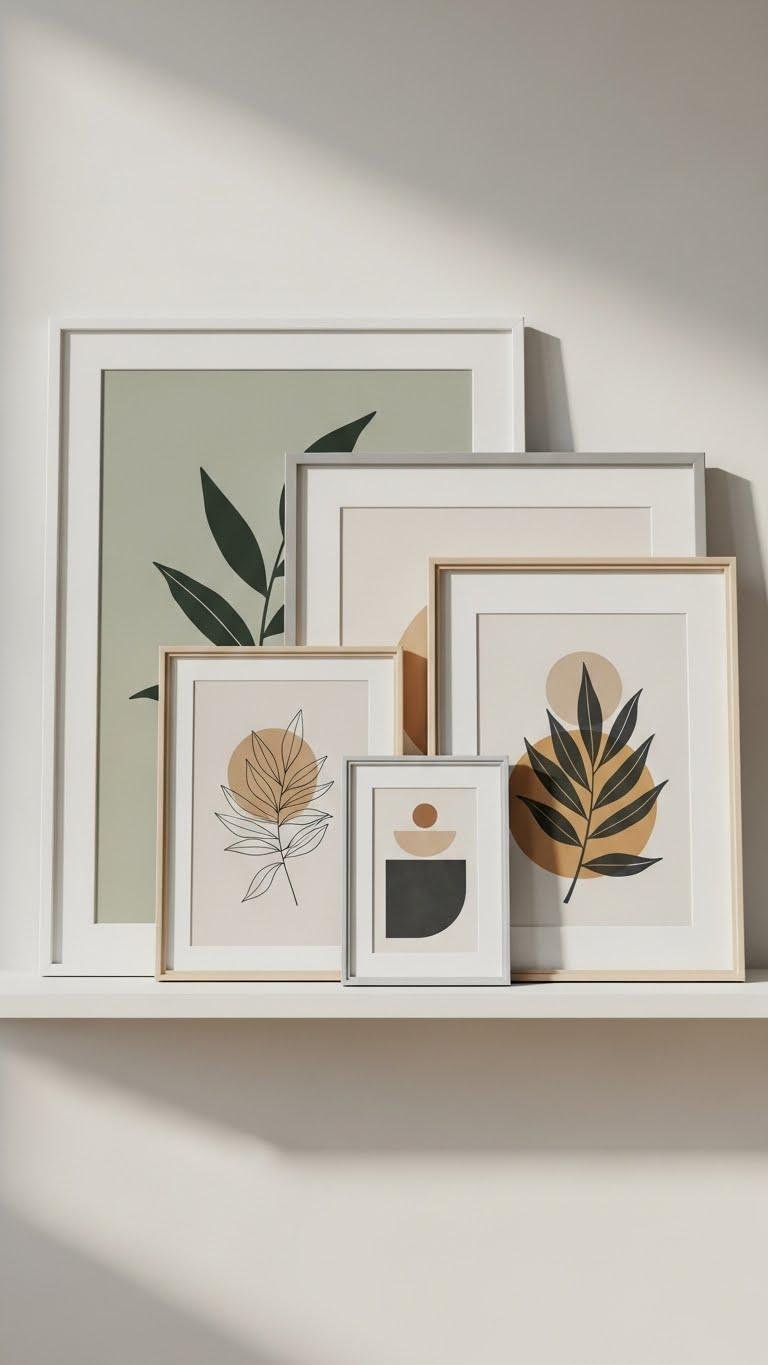 After you’ve established balance with asymmetrical objects, layer framed prints to add depth and personality without upsetting that calm centerline. You’ll lean larger matte frames at varying depths, tuck smaller works slightly forward, and choose soft matting to let images breathe.