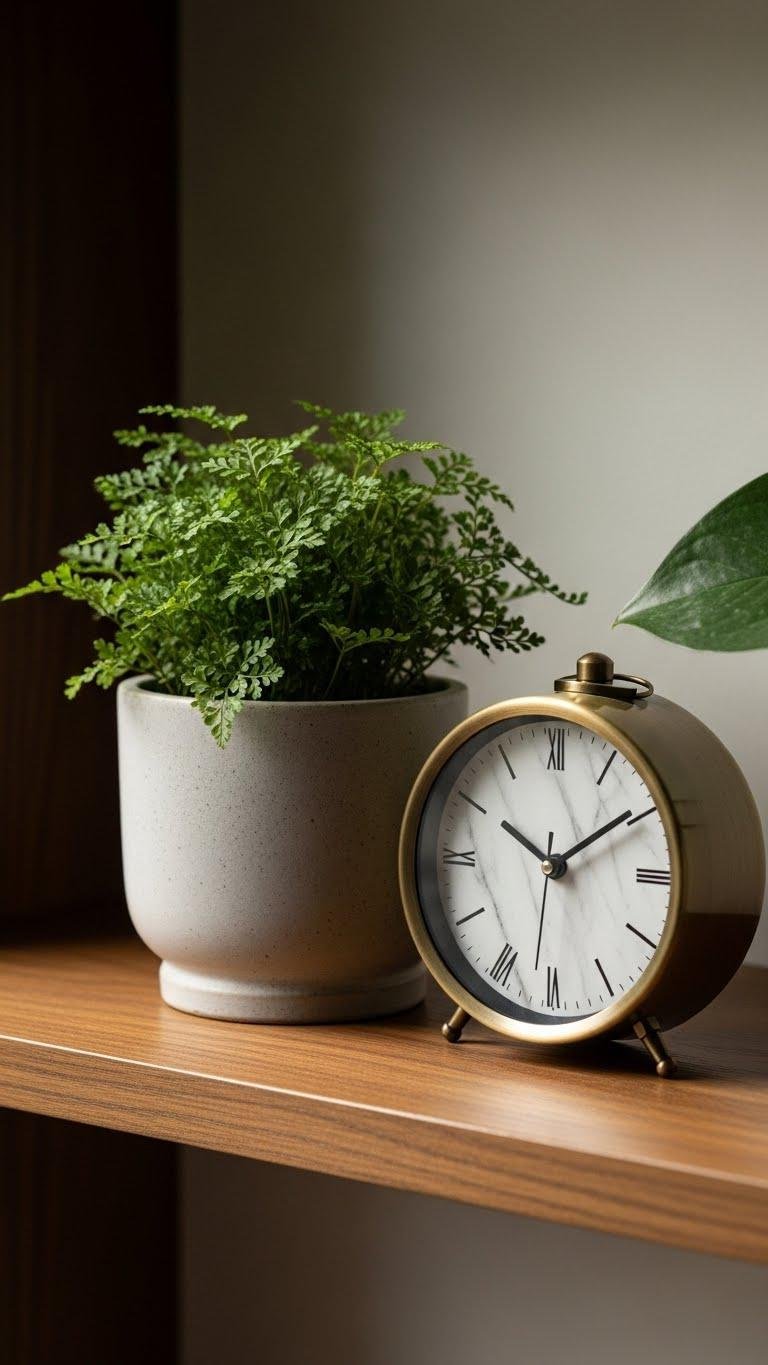 Tuck a small potted plant beside a decorative clock to create a deliberate pause on your shelf that feels both alive and measured. You’ll pair a miniature fern or ceramic pothos with a marble clock or brass alarm, mixing organic texture and sculpted metal.
