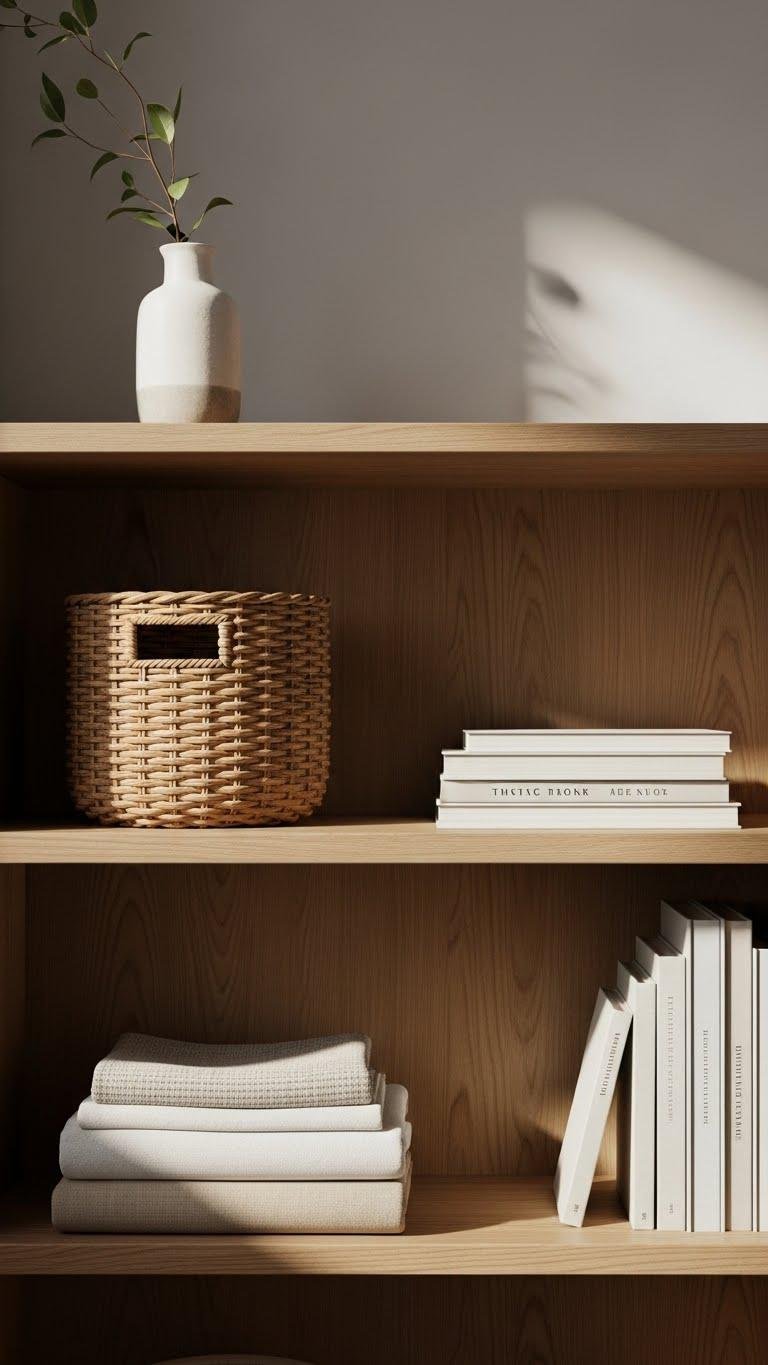 If the textured basket and soft linens bring warmth and tactility to your shelf, an open-shelf layout with generous negative space will let those elements breathe and read with greater intent. You’ll embrace negative spacing, placing select objects with restraint so each piece sings. Airy accents—single vases, pared books—create calm, curated vistas that invite movement and freedom in your room.