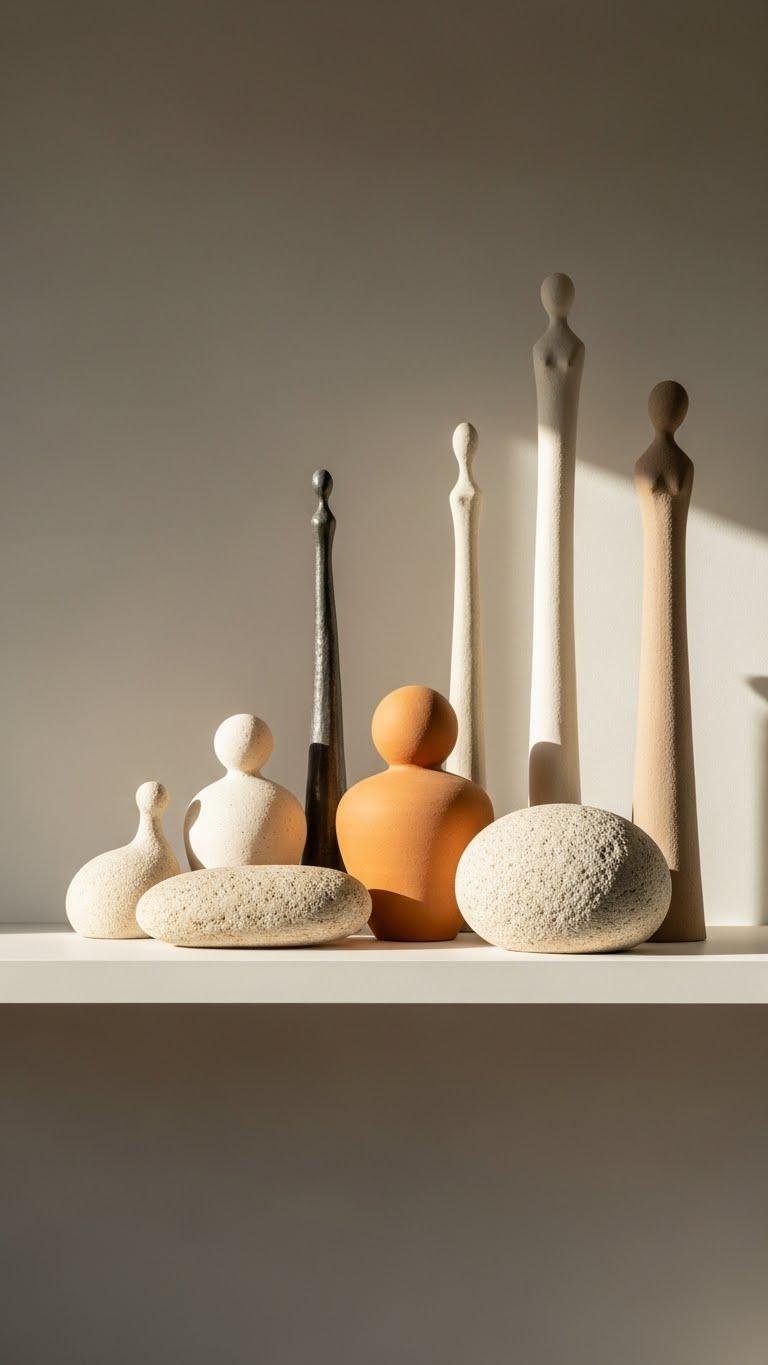 Layer sculptures at varying heights to create a rhythmic skyline on your shelf that draws the eye and defines a focal point. You’ll mix scale contrast deliberately, pairing tall, slender pieces with low, rounded forms to suggest movement and openness. Arrange a restrained focal grouping so each object breathes; you’ll keep balance while embracing an unfussy, liberated aesthetic that feels calm and intentional.