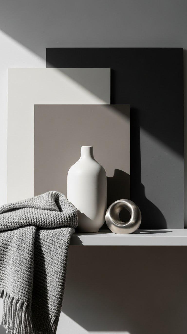 You’ll create quiet drama by limiting the palette and layering contrasting textures—matte paint, nubby knit, smooth ceramic, and brushed metal—that let form and light do the talking.