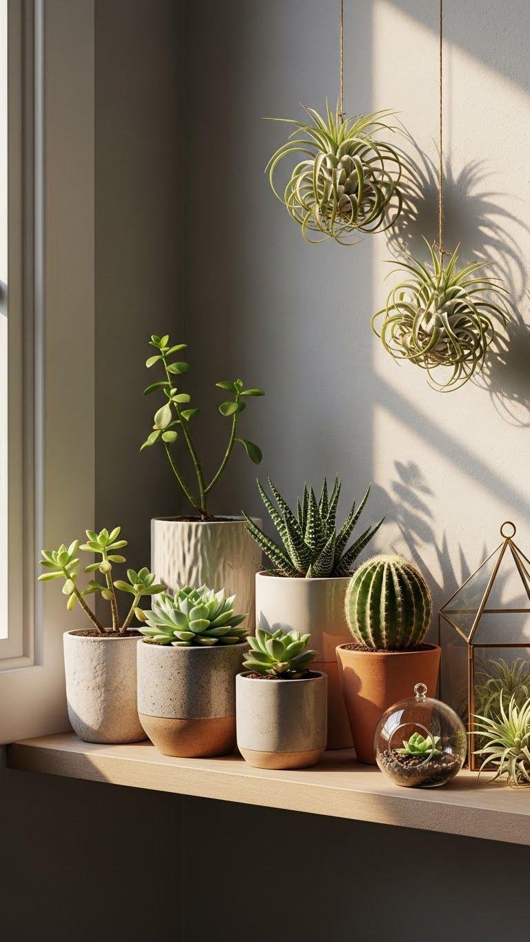 A small cluster of succulents brings a confident, livable calm to a shelf corner—group plants of varied heights and leaf shapes in tactile ceramic or terracotta pots, leaving breathing room between each piece so the eye can move and each silhouette reads clearly.