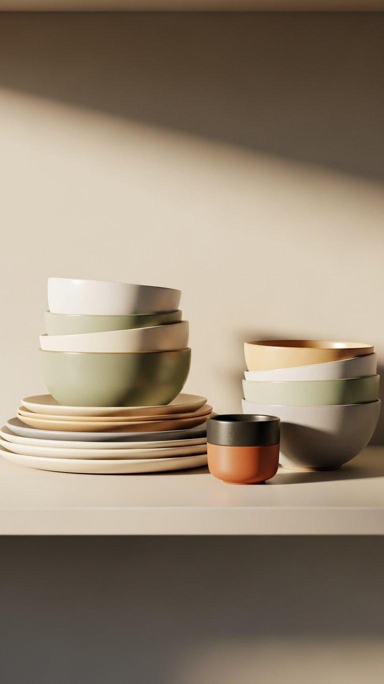 Move your eye from the planted corner to a tidy stack of bowls and plates to keep the shelf feeling lived-in but composed.