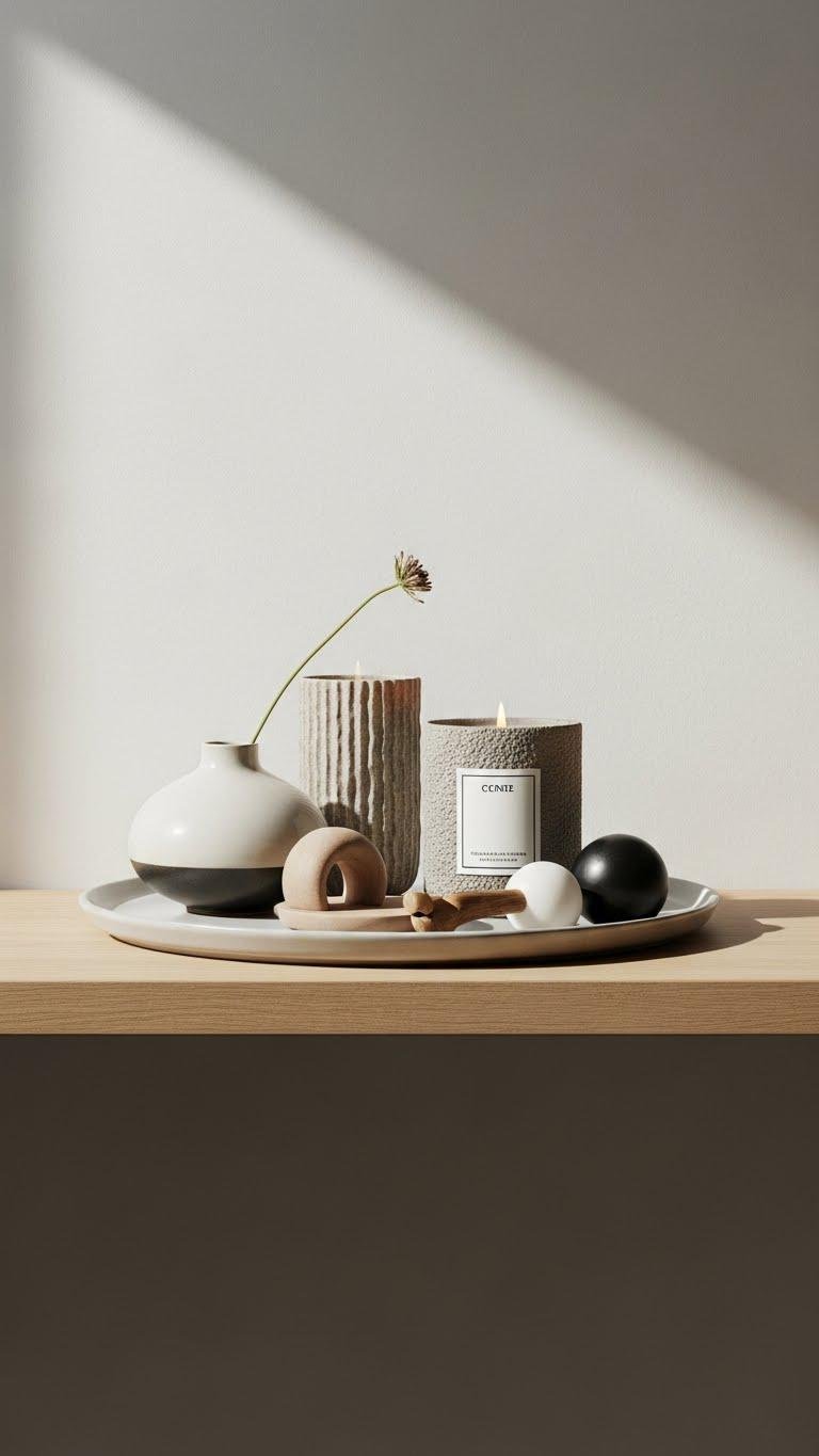 Center a shallow tray to anchor a cluster of objects and instantly give the shelf a composed, gallery-like focus. You’ll place a matte tray, a low vase, and a scented candle together, varying texture and scale for calm rhythm. Let negative space breathe; keep pieces intentional so the arrangement feels curated, balanced, and freeing rather than cluttered.
