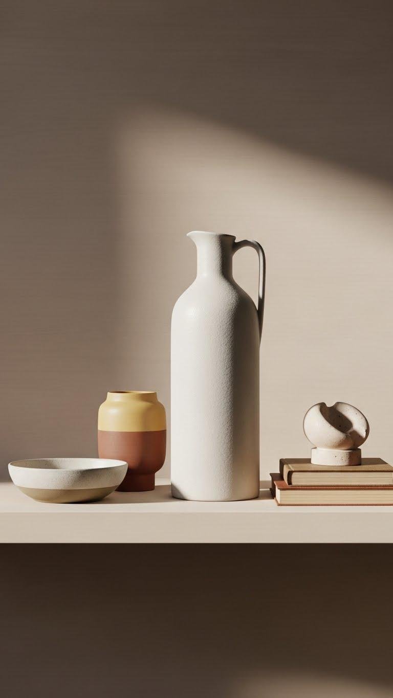 Place a tall jug as an anchoring vertical element and balance it with a few short, tactile objects to create a composed, dynamic grouping. You’ll use height contrast to guide the eye, privileging the jug’s neck focus with a simple silhouette. Arrange low bowls, stacked books, or a small sculpture nearby so each piece breathes, feels intentional, and lets your shelf express effortless freedom.