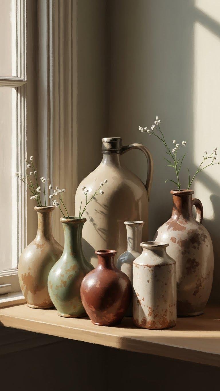After you’ve used a tall jug and low objects to set a clear vertical rhythm, bring in a cluster of vintage vases to create a softer, more lyrical counterpoint. You’ll curate pieces with aged patina and varied heights, letting floral silhouettes whisper rather than shout. Arrange them loosely, leaving negative space so each shape breathes and your shelf feels effortless, open, and free.