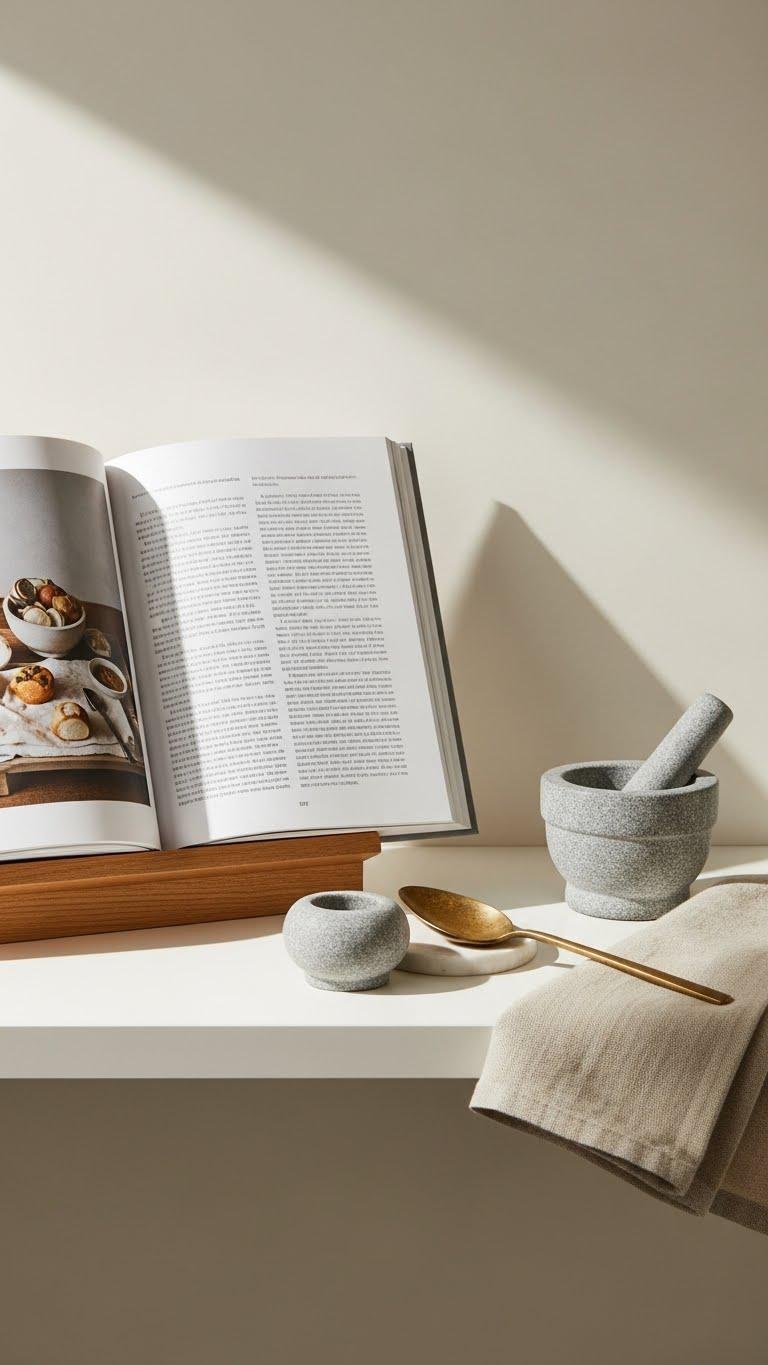 A cookbook zone anchored by a simple stand turns recipes into display art, and you’ll want it to feel both useful and elegantly edited. Place a cookbook podium slightly off-center, open to a favorite page, and balance it with an accessory trio: a small mortar, a brass spoon, and a folded linen. You’ll enjoy a curated, airy shelf that invites spontaneous cooking.
