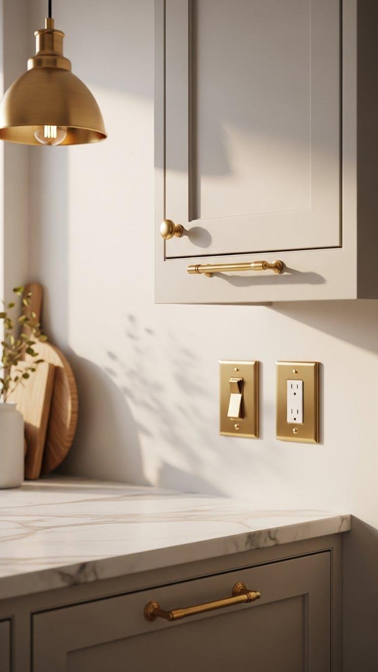 Swap to matching polished switchplates and coordinating cabinetpulls to unify surfaces.